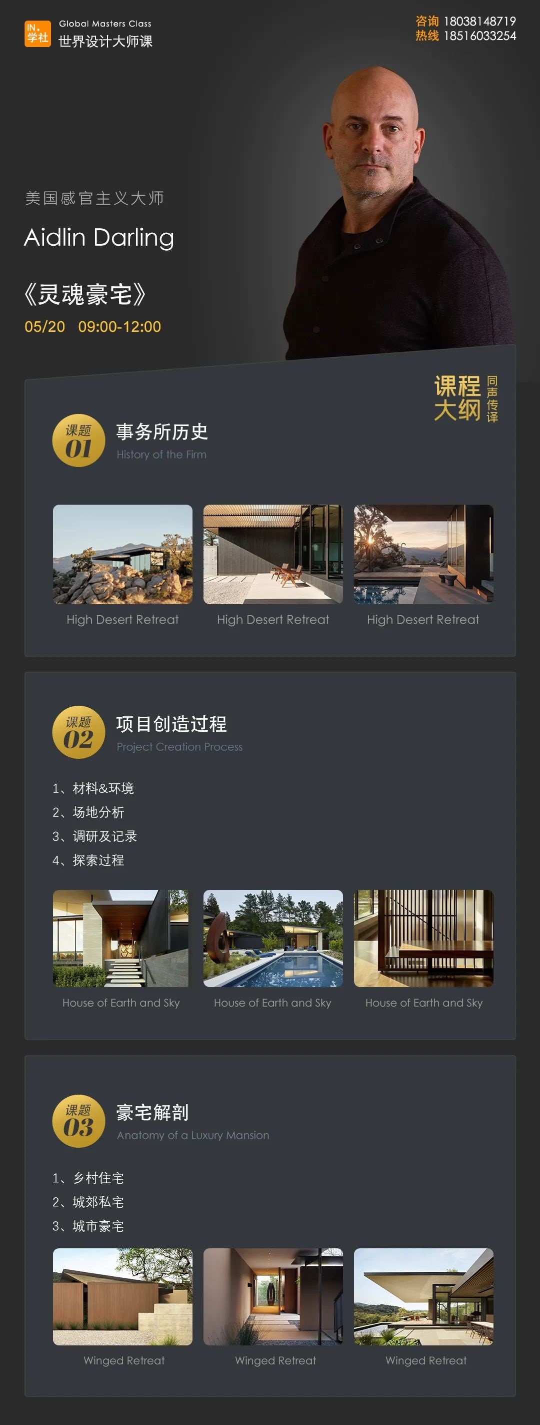 Aidlin Daring寄语━在追求视觉至上的当下,身为设计师的我们有必要把焦点集中在身体和大脑所带来的感官体验之上。在本次大师课中,我们首先会关注到一家为感官体验而设计的事务所,他们对我们影响至深。过去的25年,我们在世界各地完成了许多类型的公共或私人的项目委托,因此也探索出形式多样的住宅设计策略,它们有着不同的场地因素,涉及城市、郊区和广袤的乡村。我们希望借由一系列具有治愈性的建筑案例分享来为大家来展示我们事务所多年以来的设计实践。In a world that is currently obsessed with visual stimulation, it is credibly important as designers that we pivot our focus to the other four senses that the human body and mind provide us. This lecture will focus first on the early influences that shaped a studio whose ethos centers around designing for all the senses. In the past twenty-five years, the studio has had the great pleasure of engaging in both public and private commissions that span the globe.The breadth of locations and site conditions from deeply urban, and suburban, to vast rural landscapes, has allowed the firm to explore an incredibly diverse set of strategies for human occupation. The lecture will open the doors to our studio's design process through a series of case studies that center on architecture that seeks to heal the soul.