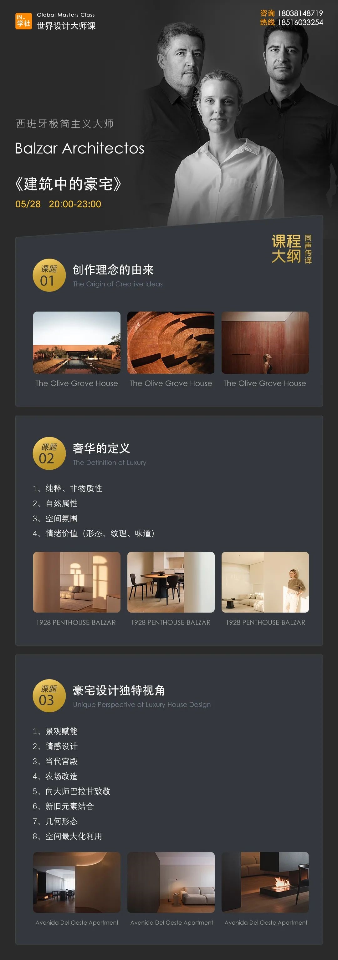 Balzar Arquitectos寄语━如今,“奢华”一词被广泛地应用并以至于滥用的程度,尤其是在房地产领域。“豪宅”和周边的配套环境、地产的经济价值、房屋面积大小,或是装修成本联系了起来。在我们的观点中,奢华的建筑代表着某些纯粹的、非物质性的事物,它存在于自然环境中,是幸福的显现,很大因素上影响着人们的情绪。本次大师课中,我们会通过解析一系列具体项目的创作过程,向每位学员展示每个项目中真正的“奢华”内涵。In the society we live in today, the word 'luxury' is used too easily, especially in the real estate industry. Luxury houses are linked to a neighborhood, the economic value of real estate, the size of the house area, or the cost of decoration. In our view, luxurious architecture represents certain pure, intangible things that exist in the natural environment and are a manifestation of well-being, greatly affecting people's emotions. In this master class, we will explain to the audience the 'luxury' of each project by explaining the creative process of a series of specific projects.
